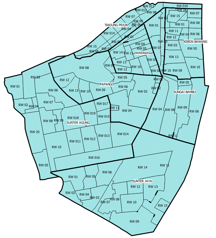 Kecamatan Tanjung Priok memiliki luas wilayah 2.251,74 ha, yang terdiri atas 104 RW dan 1275 RT dengan luas masing-masing kelurahan sebagai berikut :